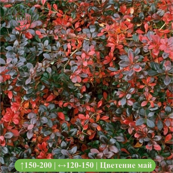 Барбарис Red Juwel — декоративный сорт среднего размера с густой, округлой кроной и яркой окраской листвы. Высота взрослого куста достигает 1,5–2 м при ширине до 1,5 м. Весной и летом листья пурпурно-бордовые, к осени становятся насыщенно-красными с багряным оттенком. В мае куст цветёт небольшими жёлтыми цветками, а к осени формирует ярко-красные ягоды, сохраняющиеся до зимы и придающие дополнительную декоративность.