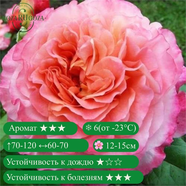 Augusta Luise — роскошная роза с крупными густомахровыми цветками диаметром 12-15 см. Окраска меняется в зависимости от погоды: от абрикосово-розовой до лососёво-оранжевой, с мягкими переливами. Цветение повторное, с июня до осени. Аромат насыщенный, фруктово-цветочный. Куст высотой 70–120 см, шириной до 70 см, с тёмно-зелёной глянцевой листвой.