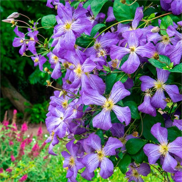 Клематис Janny — очаровательный сорт с нежными розово-сиреневыми цветками диаметром 10–12 см. Лепестки слегка волнистые, с более насыщенной полосой по центру, придающей цветку глубину. Цветение обильное и продолжительное: первая волна — в июне на прошлогодних побегах, вторая — в августе на молодых. Отличается аккуратной формой куста и устойчивостью к выгоранию.
