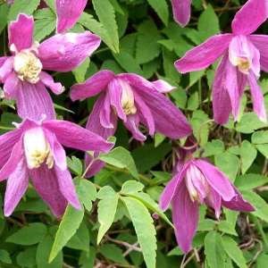 Клематис Constance — изящный и надёжный сорт из группы альпийских клематисов (Atragene group), отличающийся ранним и обильным цветением. Лиана густо покрывается пониклыми колокольчатыми цветками диаметром 5–6 см. Лепестки бархатистые, розово-малиновые с более светлой внутренней стороной, придающей цветку мягкое свечение. После цветения на растении формируются декоративные серебристые пушистые семенные головки, сохраняющие привлекательность до осени.