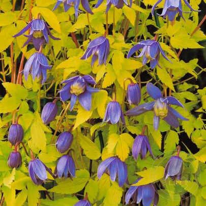 Клематис Stolwijk Gold — оригинальный сорт из группы Alpina с золотисто-зелёной листвой и синими колокольчатыми цветками диаметром 5–6 см. Цветение начинается в мае, создавая яркий весенний акцент. Лиана сохраняет декоративность до осени благодаря необычной окраске листьев и пушистым семенным головкам.