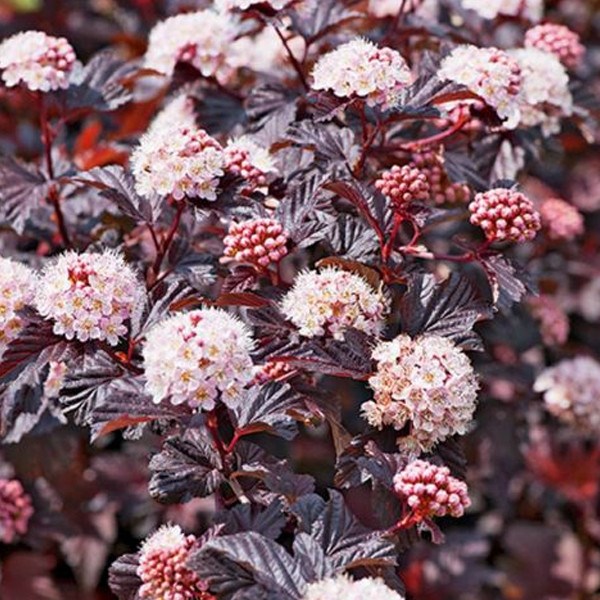 )Пузыреплодник Леди ин Ред - Кустарник с компактной, плотной, подушковидной кроной с многочисленными коричнево-пурпурными побегами, высота 80-100 см. Листья цельные, 3-5-лопастные, изящные, узорчатые. Молодые листья оранжево-красные, затем становятся насыщенно-бордовыми, на верхушках оранжево-красные. Цветки мелкие, розовато-белые, собраны в плотные щитковидные соцветия. Плоды - вздутые листовки, краснеют при созревании, несъедобны. Цветение: июнь-июль.