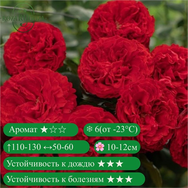 - Цветки: густомахровые, 10–12 см, бархатно-красные