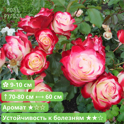 - Цветки: густомахровые, 9–10 см, белые с красной каймой