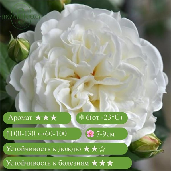 - Цветки: густомахровые, белые, 7–9 см