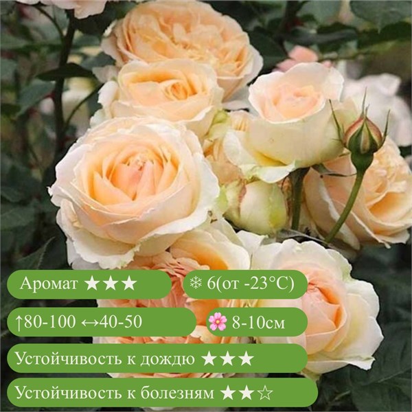- Цветки: густомахровые, 8-10 см, абрикосово-розовые