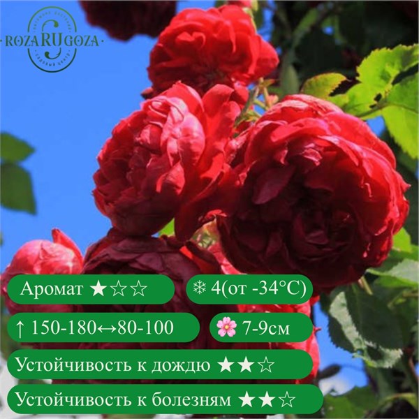 Цветки: густомахровые, бархатисто-красные, 8–10 см