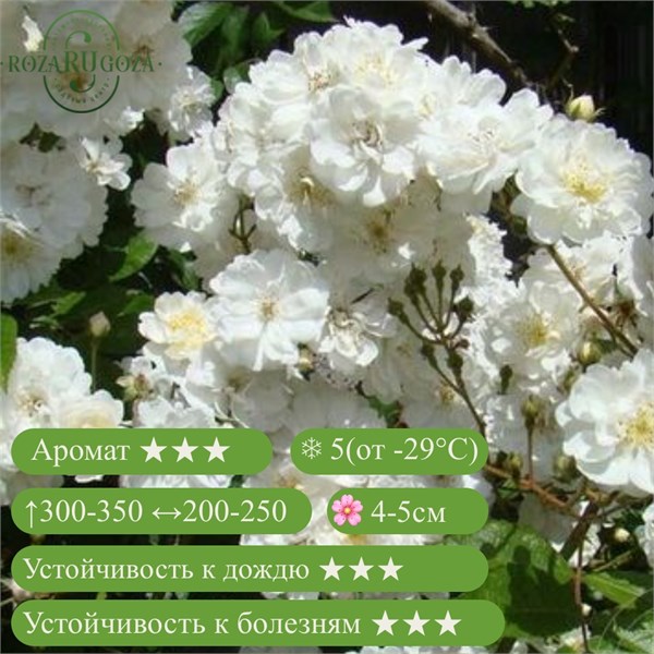 Guirlande d'Amour — изысканный мускусный гибрид с тонкой архитектурой куста и очаровательными кистями снежно-белых махровых цветков. Бутоны распускаются в некрупные (4–5 см), но многочисленные, густомахровые цветки с волнистыми лепестками, собранные в пышные кисти по 10–20 штук. Цветение обильное и практически непрерывное с июня до глубокой осени.