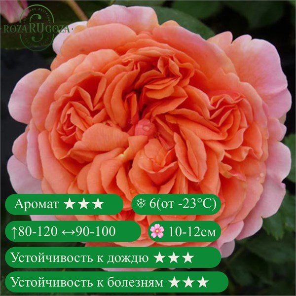 - Цветки: густомахровые, 10-12 см, абрикосово-розовые