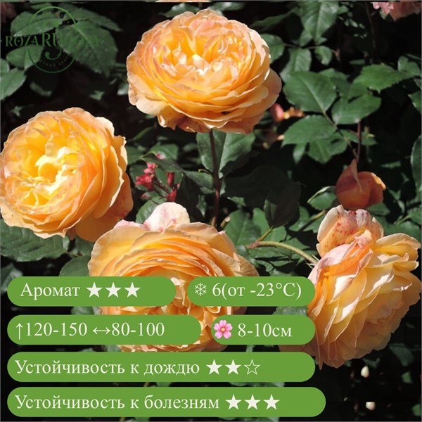 - Цветки: махровые, 8–10 см, абрикосово-оранжевые