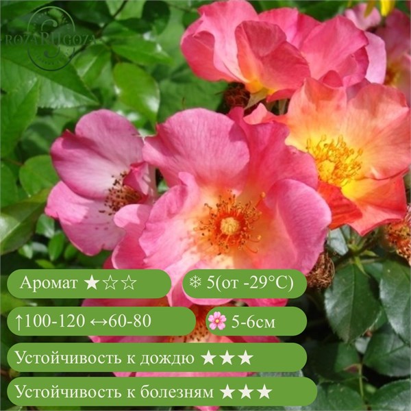 - Цветки: густомахровые, 5-6 см, абрикосово-розовые