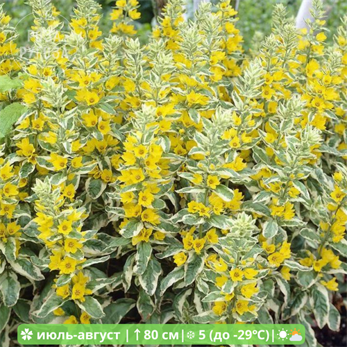 Alexander — эффектный пёстролистный сорт вербейника точечного, сочетающий декоративную листву и яркое цветение. Куст прямостоячий, плотный, высотой 60–80 см и шириной до 50 см. Главная особенность сорта — необычная листва с зелёным центром и широким кремово-белым кантом, который сохраняет яркость весь сезон. В июне–июле над листвой появляются крупные жёлтые звёздчатые цветки, собранные в густые колосовидные соцветия. Сорт устойчив, неприхотлив, быстро разрастается, образуя декоративные куртины.
